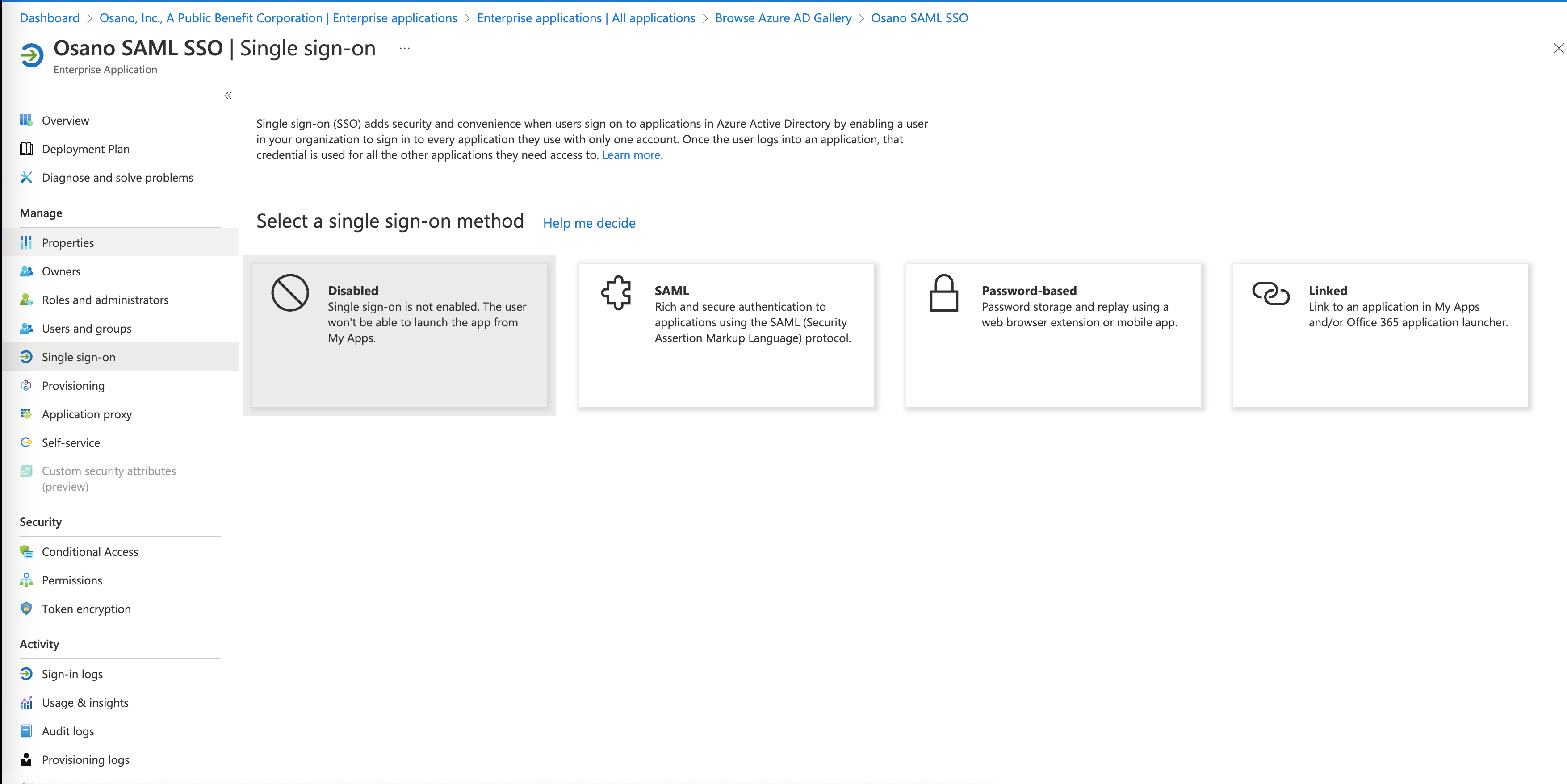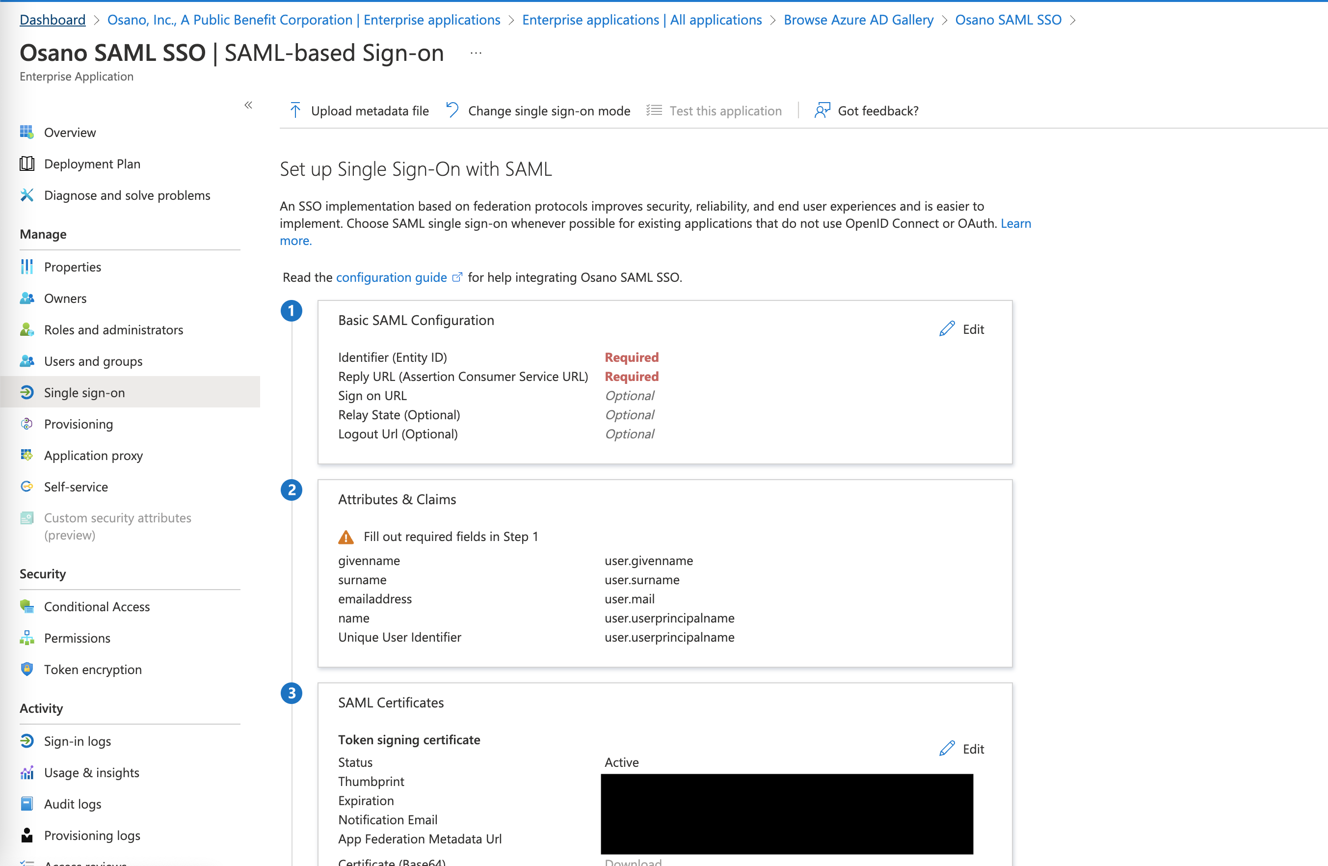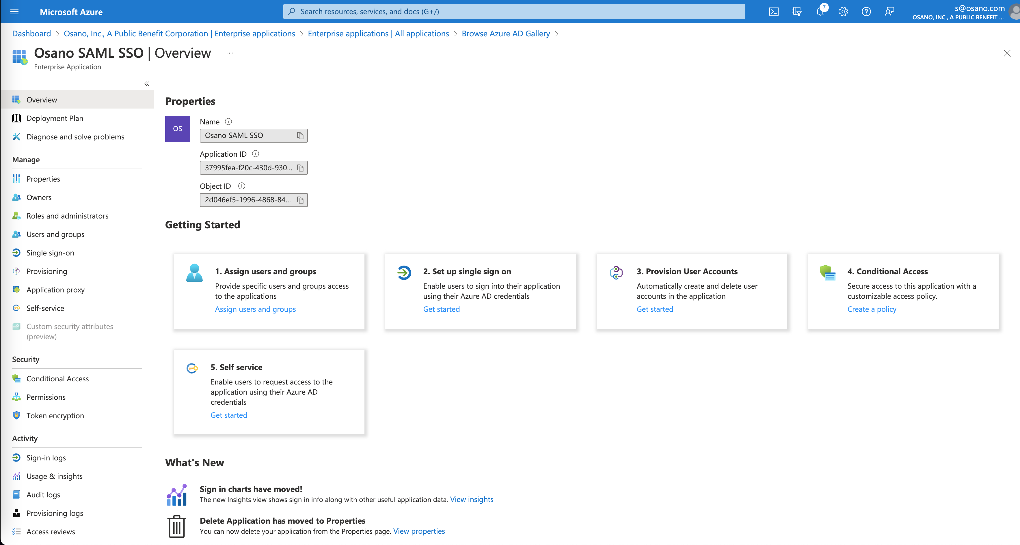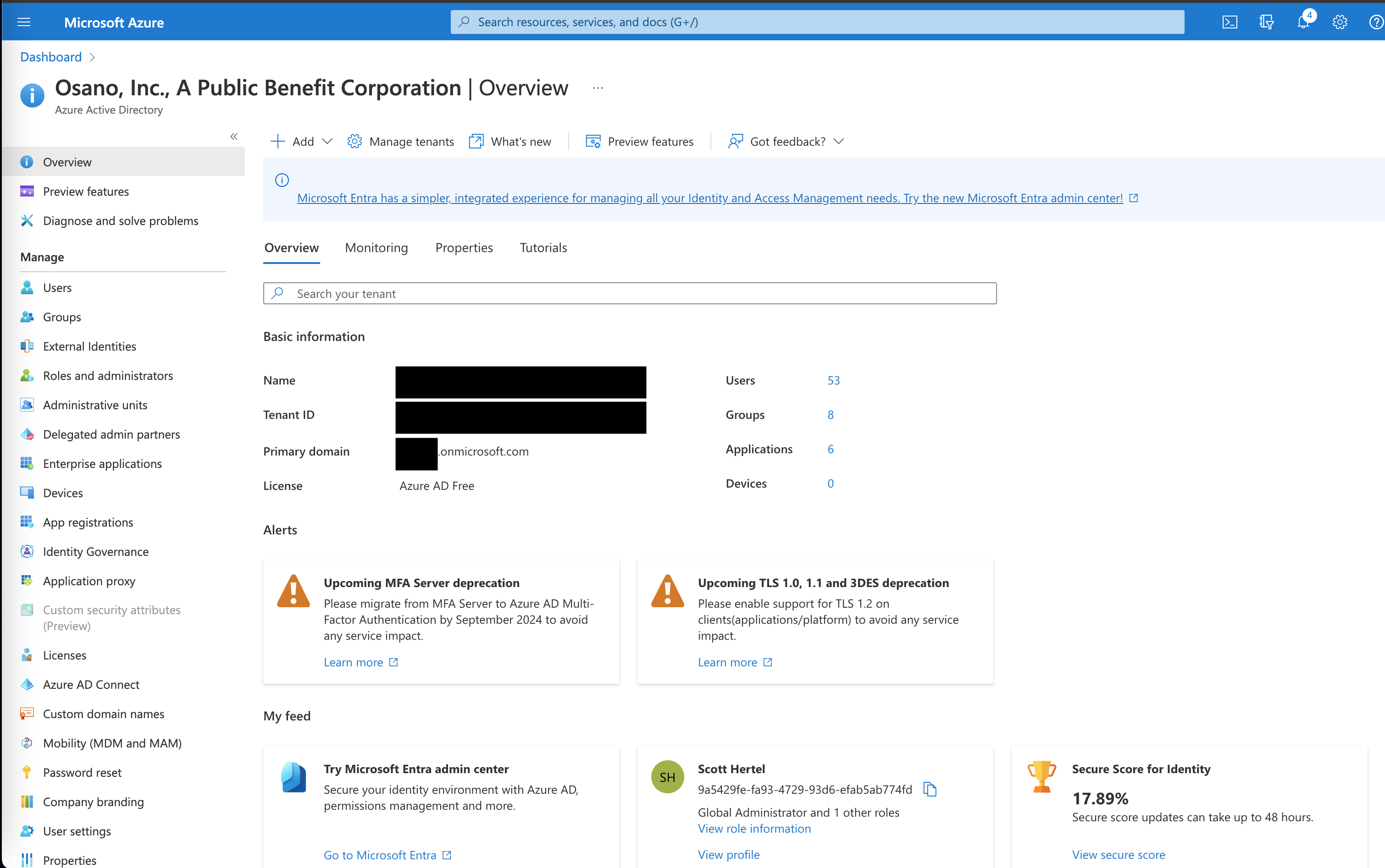 - Navigate to the Azure Active Directory dashboard. Remember to share your authentication domain, in the case below ***.onmicrosoft.com, with Osano.