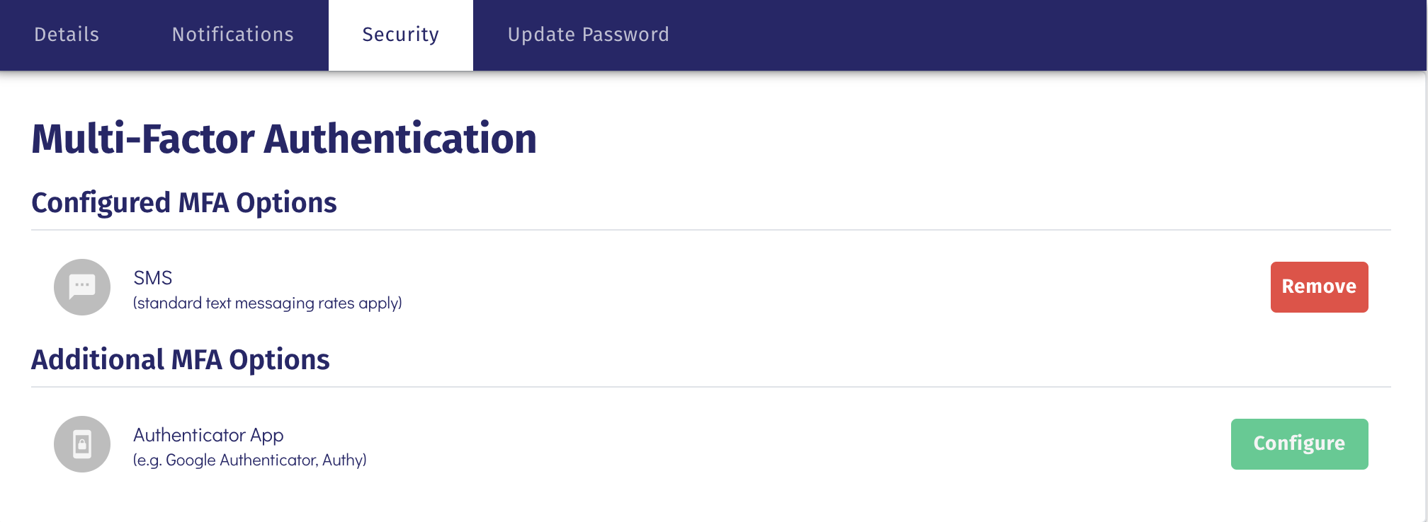 If successfully submitted, Authenticator will be configured and you will see a "Remove" button next to the authenticator option.