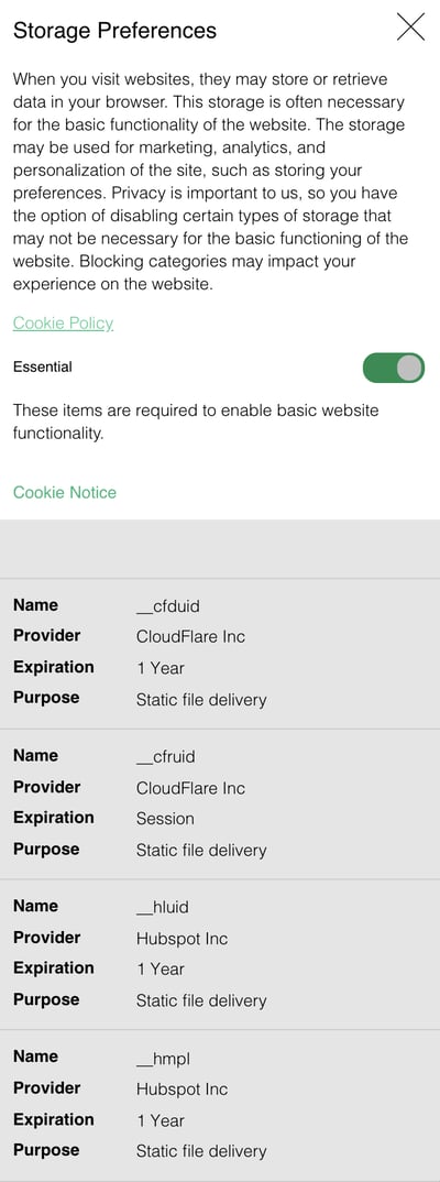 Republish your configuration in order for your end-users to begin seeing cookie disclosures. When your cookies are disclosed, they appear in the storage preferences drawer on your website for users to access.