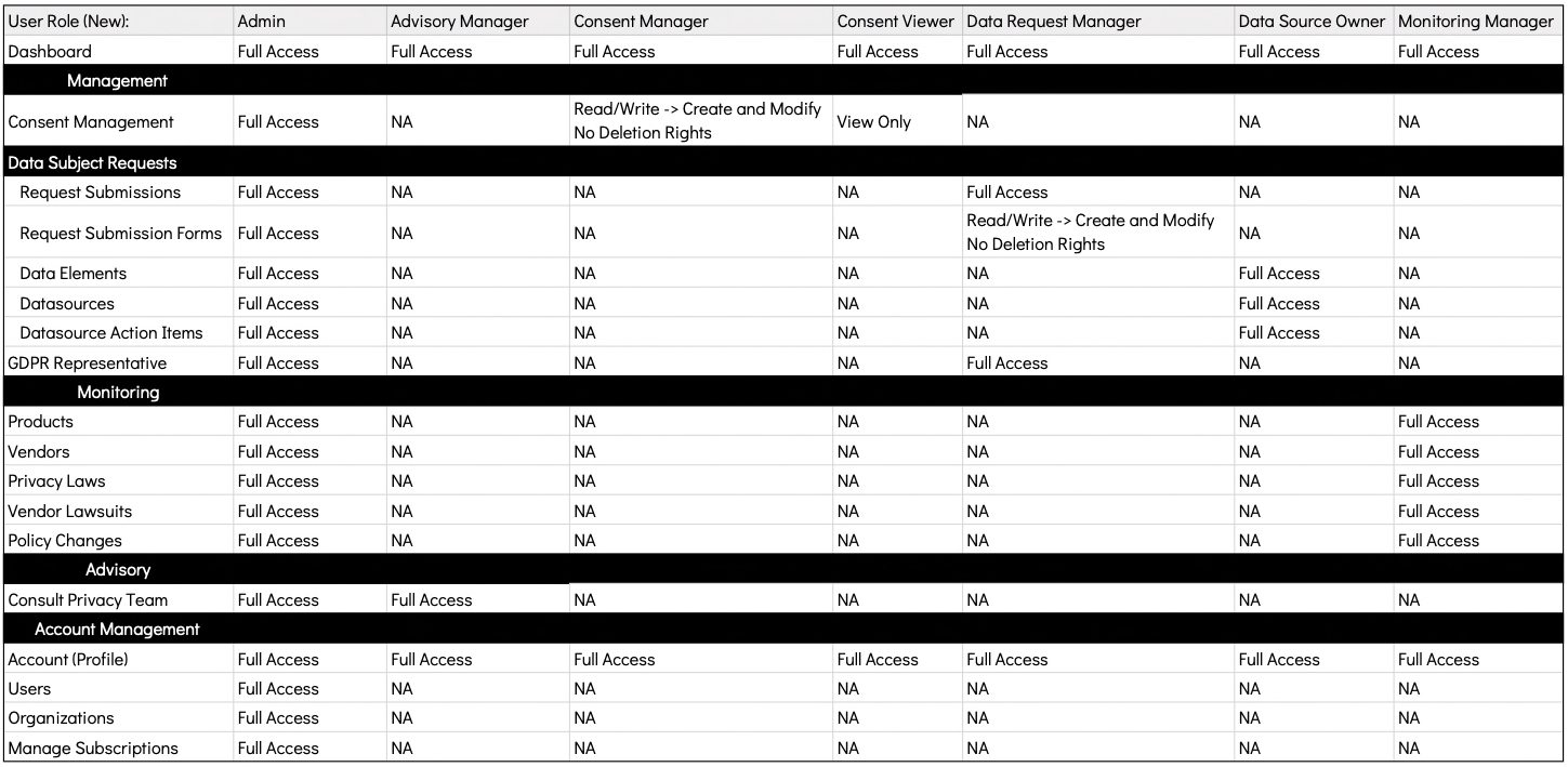 Consent Management | Full Access | NA | Create and Modify No Deletion Rights |